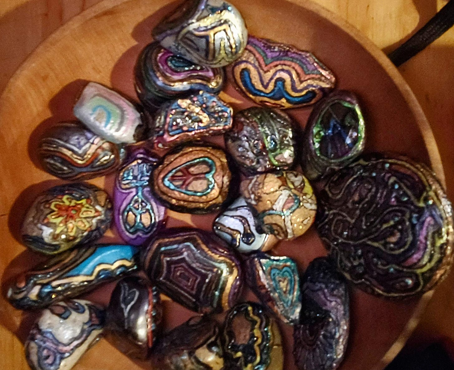 The other half of completing this cycle is my carrying some smaller probably ‘finished’ ones around in my left front pants pocket, on exiting my apartment for wherever I might go beyond my comfy little cave. Sometimes I go out of my way to have a short conversation or maybe longer one with somebody, most are very pleasant and acquainting. Then given even the smallest amount of time for a further exchange I pull out the handful to show them and say something like I've been painting these stones and I love to share them when I have a good connection. Never never fails to bring some additional value to both of us. And I always ask because it's a completion for me the artist, “What do you see?” The answers are fabulous and go way beyond any particular visions I might have had while painting; and of course I always ask people to take one if they see one they like - which they always do! I feel completed as the artist, as another person inhabiting the same world. And you never know who you might meet this way, it's fascinating, literally heartwarming